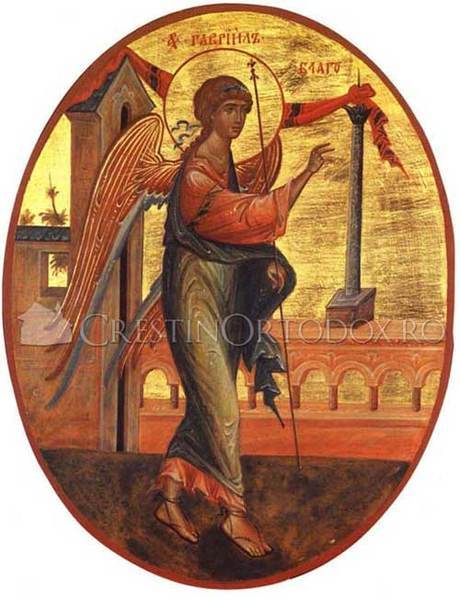 O, Gavriile, Arhanghel al luminii line, care celor de demult le-ai deslusit calea si le-ai vestit soroacele, care neincetat veghezi peste fata pamantului prin dumnezeiasca randuiala, care la sfarsitul veacurilor cu Dreptul Judecator vei fi la innoirea lumii, cerceteaza-ne si pe noi, nevrednicii veacului acestuia, si pazeste-ne de vrajmasii nostri vazuti si nevazuti, de tagma lui Irod si de tagma Satanei, ca sa nu ne smintim si sa nu ne pierdem, ci sa dobandim si noi cetatenia Ierusalimului ceresc, unde laolalta cu ingerii si cu sfintii sa vesnicim cantand: Aliluia!
