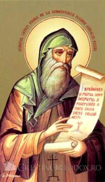 Intocmai ca un inger ai vietuit pe pamant, fericite Parinte, iar dupa mutarea ta la cele nepieritoare, fiind randuit de Dumnezeu in ceruri, ai aflat impreuna-vietuire cu ingerii. De aceea, bucurandu-te de slava cea negraita, inalti neincetat cu cetele ceresti Prea Sfintei Treimi cantarea. Aliluia!