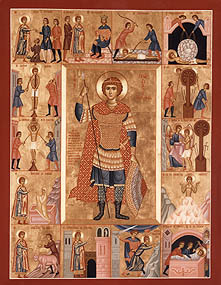 Cu cantari de psalmi serband amintirea si luptele tale, Mucenice, te Iaudam pe tine si te binecuvantam din suflet, ca pe un fierbinte aparator al lumii, si toti cu cantarile, ca si cu buzele, sarutandu-te, strigam catre tine: