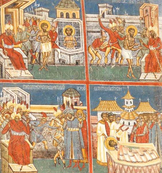 Avand in minte bunatatile, pe care vrei sa le dobandesti, mucenice a lui Hristos, vrednicule de lauda, intelepteste ai rabdat toate schingiuirile, ruperile si sfasierea carnurilor; pentru aceea tiranul, umplandu-se nebuneste de si mai multa manie, si racnind ca o fiara saalbatica, a poruncit ca iarasi sa fii chinuit mai cu asprime si fara de crutare sa fii batut. Iar cand se faceau acestea, tu cantai lui Dumnezeu: Aliluia!