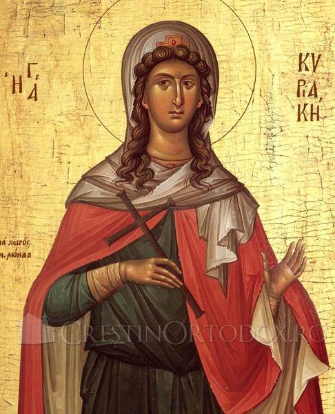 Cu dumnezeiasca ravna luptandu-te impotriva necredintei si a pacatului, ai iesit biruitoare, Sfanta Mucenita Chiriachi. Pentru aceasta te laudam noi, credinciosii, ca una ce esti invrednicita de mare har de la Dumnezeu, pentru care ti-ai dat trupul spre chinuire. Primeste, fecioara sfanta, odata cu rugaciunile si cantarile noastre de lauda:
