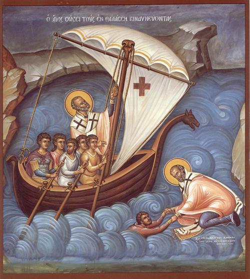 Bucura-te, mare aparator al celor ce cheama al tau nume in ajutor, cand sunt in primejdii pe ape sau pe cale, ca tu, Parinte Sfinte, pe calatori pazesti.