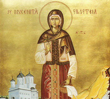 Condacele si Icoasele Condacul 1 : Ca ceea ce din pruncie jertfa fara prihana te-ai adus lui Dumnezeu, prin fapta buna, Filotee preafericita, Celui ce din pantecele maicii tale te cunostea pe tine, ceea ce te-ai aratat podoaba fecioarelor si locuitoarea camarii celei de nunta, vrednica esti de lauda ! Pentru aceasta cantam tie : Bucura-te, Filotee, fecioara prealaudata ! Icosul 1 : Plecand acum genunchii inaintea Facatorului tuturor si mainile tinzindu-le catre Cuvantul Cel mai inainte de veac, iertare gresealelor noastre cerem, putere de cuvant, luminare si pricepere mintii noastre, ca sa laudam nevointele si vitejiile fericitei Filofteea si catre dansa sa graim cu caldura unele ca acestea : Bucura-te, Filofteea, cea din rau tata nascuta; Bucura-te, ca de mama credincioasa ai fost crescuta; Bucura-te, trandafirul rasarit din maracine; Bucura-te, ca tot timpul bun miros reversi din tine; Bucura-te, ca in lume ai fost blanda mielusita; Bucura-te, ca a ta mama ti-a fost buna pastorita; Bucura-te, porunca sfanta, cu desavarsita minte; Bucura-te, ca de mica ai mers pe caile sfinte; Bucura-te, ca in chinuri ti-a fost totdeauna traiul; Bucura-te, ca rabdarea te-a facut sa castigi raiul; Bucura-te, ca necazuri suferit-ai multe foarte; Bucura-te, ca de Domnul te-ai preamarit dupa moarte; Bucura-te, Filotee, fecioara prealaudata ! Condacul 2 : Mutandu-se din viata aceasta vremelnica, binecredincioasa maica ta, te-a lasat pe tine la toata lipsa plinitoare si mostenitoare faptelor ei celor bune, pe care urmandu-le, ai cantat lui Dumnezeu neincetata cantarea : Aliluia ! Icosul 2 : Frica si cutremur ne cuprinde pe noi, cei intunecati la minte, ca nu ne pricepem de unde vom incepe a-ti aduce tie laude, fecioara, sau care cantare iti vom canta, sau cu ce cununi te vom incununa; dar indraznind, pentru rugaciunile tale cele catre Dumnezeu, cu inima umilita cantam tie acestea : Bucura-te, odraslirea cea in Tarnov rasarita; Bucura-te, cea de Domnul in rai acum rasadita; Bucura-te, aurora cu raze stralucitoare; Bucura-te, stea cereasca ce luminezi ca un soare; Bucura-te, ca in lume te-a hranit cereasca raza; Bucura-te, ca prin tine crestinii se lumineaza; Bucura-te, ca pe tine te-am castigat bogatie; Bucura-te, ca povata ne-ai dat cum sa urmam tie; Bucura-te, ca prin tine am primit hrana cereasca; Bucura-te, pilda celor ce vor sa se mantuiasca; Bucura-te, calauza sufletelor celor drepte; Bucura-te, indreptarul fecioarelor intelepte; Bucura-te, Filotee, fecioara prealaudata ! Condacul 3 : Auzind tu, fericito, glasul Evangheliei Domnului, care fericeste pe cei milostivi, tare l-ai intiparit in inima ta si cu atata credinta l-ai primit si atata l-ai iubit, incat cu infocata si dumnezeieasca ravna aprinzindu-te, cu insutite osteneli si cu sarguinta multa ai cantat lui Dumnezeu : Aliluia ! Icosul 3 : Multa purtare de grija ai avut in cugetul tau pentru saraci, fericita Filotee, pentru ca ravneai ca sa nu ramana nici unul nemiluit din cei ce asteptau de la tine milostenie, nici un flamand sa nu se duca nesaturat, nici un gol neimbracat, nici un mahnit nemangaiat; pentru care, laudandu-te, cantam tie acestea : Bucura-te, comoara milei, cea-n veci nedesertata; Bucura-te, imbracarea celor goi fara de plata; Bucura-te, celor flamanzi paine buna, hranitoare; Bucura-te, celor straini casa adapostitoare; Bucura-te, izbavitoare a celor primejduiti; Bucura-te, alinare a ranii celor scarbiti; Bucura-te, celor cazuti grabnica sprijinitoare; Bucura-te, la nevoie fierbinte folositoare; Bucura-te, feciorie, cu milostenie-nsotita; Bucura-te, tinerete, cu viata-mbunatatita; Bucura-te, mangaierea celor ce se roaga tie; Bucura-te, ca prin moarte ai ramas deapururi vie; Bucura-te, Filotee, fecioara prealaudata ! Condacul 4 : Vazandu-te pe tine vrajmasul firii omenesti ca te-ai apucat de lucrarea ei savarsirea faptei celei bune si mai vartos de fapta care fi-va laudata in ziua Judecatii, a socotit sa te impiedice pe tine ca oarecand pe Eva in rai, dar n-a putut, caci neincetat cantai lui Dumnezeu : Aliluia ! Icosul 4 : Ca viforul s-au pornit asupra ta uratii si spurcatii diavoli si ispitiri fara de numar ti-au adus, ca prin multimea si greutatea ispitelor sa te intoarca pe tine de la o lucrare ca aceasta. Dar tu, fericita, fiind intemeiata pe Hristos, Piatra cea din capul unghiului, tare i-ai sfaramat pe ei; drept aceea vrednica esti a te cinsti cu acestea : Bucura-te, fericito, cea de fapte bune plina; Bucura-te, ca prin chinuri te-ai imbracat cu lumina; Bucura-te, desfatarea maicii tale iubitoare; Bucura-te, diadema a-nteleptelor fecioare; Bucura-te, prunca sfanta a Domnului urmatoare; Bucura-te, milostiva, cea de saraci iubitoare; Bucura-te, ca pe diavol tu l-ai umplut de rusine; Bucura-te, ca satana a fost biruit prin tine; Bucura-te, ca credinta ai avut in Hristos, tare; Bucura-te, ca rasplata dobandit-ai prin rabdare; Bucura-te, vitejie, in trup de copil lucrata; Bucura-te, biruinta, de Duhul Sfant insuflata; Bucura-te, Filotee, fecioara prealaudata ! Condacul 5 : Vifor de urgie mare a pornit tatal tau cel intunecat la minte si impietrit la inima, sufland cu ingroziri si cu chinuri asupra ta, fericita Filotee; dar n-a putut sa te clinteasca, pentru ca intemeiata erai pe Piatra credintei, Hristos, pe care tu, preainteleapta fecioara, stand, lui Hristos, Celui ce te intarea pe tine, ai cantat : Aliluia ! Icosul 5 : Cine din pamanteni poate sa spuna cu deamanuntul chinurile tale cate ai suferit de la tatal tau cel intunecat la cuget, si de la mama ta vitrega ? si ce minte poate sa priceapa rabdarea ta, intru toate cate ai patimit ? Drept aceea, minunandu-ne de viata ta cea mai presus de fire, te laudam cu fericiri ca acestea : Bucura-te, cea de Domnul pentru mila randuita; Bucura-te, ca mult fost-ai de tatal tau chinuita; Bucura-te, ca adesea fost-ai si crunt biciuita; Bucura-te, ca pe spate si pe obraz ai fost lovita; Bucura-te, caci chinuri grele si batai ai indurat; Bucura-te, ca pe toate cu tarie le-ai rabdat; Bucura-te, ca-n