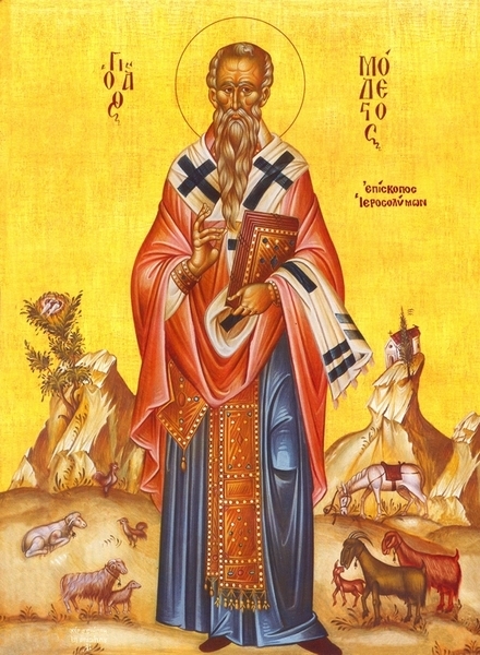 Pe ierarhul si Mucenicul lui Hristos, pe marele Modest veniti credinciosi la preacinstita lui pomenire, sa-l laudam cu dumnezeiesti cantari, ca fiind plin de dragoste de Dumnezeu si de toata faptura lui, s-a facut plin de darul tamaduiri a toata boala dobitoacelor celor necuvantatoare. Prin aceasta fiind noua oamenilor mare ajutor in scarbe si nevoile noastre, al celor ce-l rugam cu credinta si cu smerita multumire in cantam: Bucura-te, Sfinte Modeste, lauda ierarhilor si a mucenicilor!