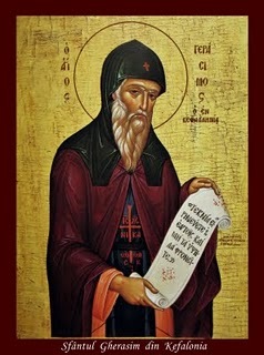 Sfinte Gherasim, robule al lui Hristos, cel ce ai stralucit inaintea oamenilor ca lumina in intuneric, care ai calauzit poporul spre cunoasterea adevaratului Dumnezeu, primeste de la noi aceasta putina rugaciune. Vezi , sfinte , durerile noastre. Vezi necazurile care ne apasa. Vezi multimea ispitelor care ne invaluiesc neincetat. Roaga-te lui Dumnezeu pentru noi, asa cum te-ai rugat pentru multimea credinciosilor care marturisesc minunile tale. Mare dar ne-a facut noua Domnul prin neputreziciunea sfintelor tale moaste. Ca ne-am intarit in credinta auzind ca bolnavii care s-au atins de racla ta au fost vindecati si ca i-ai alungat pe diavoli de la cei indraciti. O, Sfinte Gherasim, precum ai scapat insula Kefaloniei, cum ai scapat-o de jugul agarenilor si de multe necazuri, tot asa ajuta-ne si pe noi. Am cautat usurare prin puterile noastre, dar nu am aflat. Am cautat ajutor de la oameni , dar am ramas nemangaiati. La tine venim, sfinte, nadajduind ca nu ne vei rusina. Ci ne vei da cele de trebuinta, aratandu-ne care este calea pe care trebuie sa mergem. Stim ca daca in viata alegem dupa voia noastra cea rea ramanem lipsiti de ajutorul dumnezeiesc. Roaga-te pentru noi, tu, sfinte, sa cunoastem si sa facem voia lui Dumnezeu, ca sa ajungem in raiul cel preadulce, in care tu il lauzi pe Dumnezeu cu toti sfintii si cu toate puterile ceresti , in vecii vecilor. Amin.